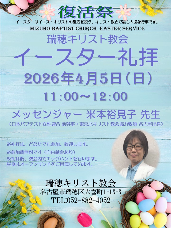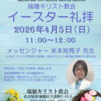2026年イースター礼拝のご案内 English Below 瑞穂教会では、4月5日(日) にイースター礼拝があります。 イースターは、イエス・キリストの復活をお祝いするキリスト教会が最も大切にするイベントで、世界中の教 …